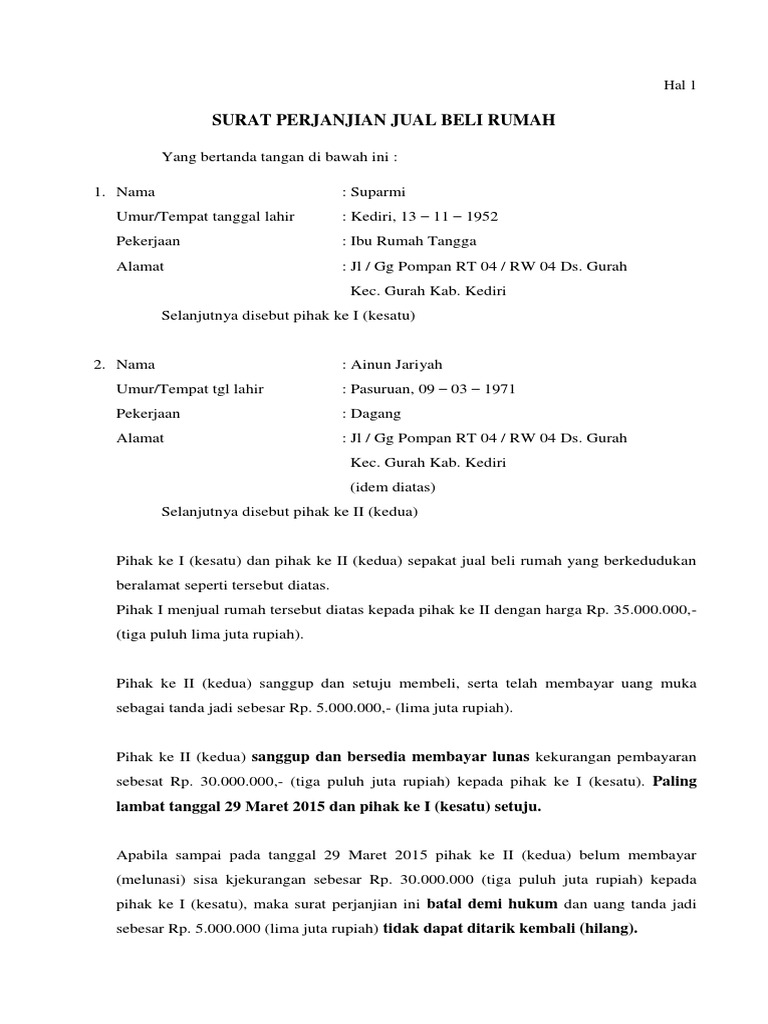 Mohamad sebagai tanda booking sebanyak 3% daripada harga jual iaitu rm 6,360.00 perlu dijelaskan pada hari ini. Ajb atau akta jual beli adalah salah satu dokumen penting yang harus anda miliki sebagai salah satu dokumen penting yang menyatakan status kepemilikan anda. Terkait isinya, berikut beberapa poin penting surat perjanjian jual beli rumah yang haru kamu tujuannya, agar spesifikasi rumah lebih detail dan risiko kesalahan objek transaksi lebih kecil. Pihak kedua akan memberikan uang tanda jadi sebesar [(rp. Berencana membeli atau menjual rumah ?